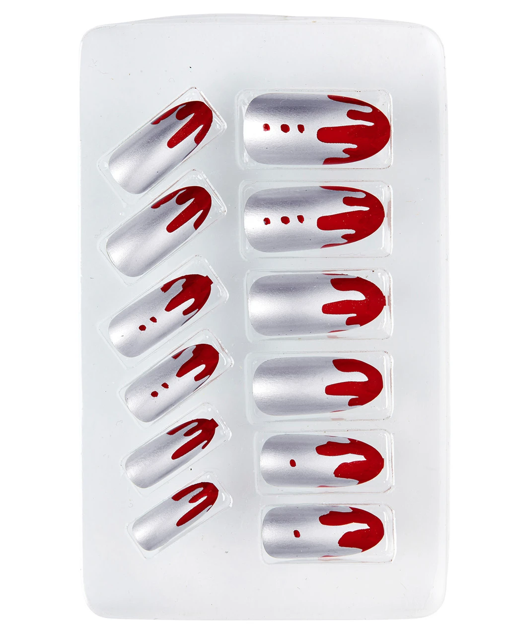 Silber-metallisch glänzende, selbstklebende Fingernägel mit Blutflecken