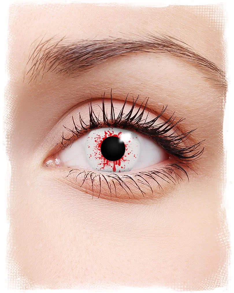 Die weißen Kontaktlinsen mit Blutspritzern verleihen dir einen mörderischen Blick. Die gruseligen Blutbad Kontaktlinsen verpassen dir einen absoluten Psycho Look bei dem Groß und Klein schockiert sein werden. Mit diesen Motivlinsen stehst du im Mittelpunkt und bist der Blickfang bei jeder Halloween-Party.