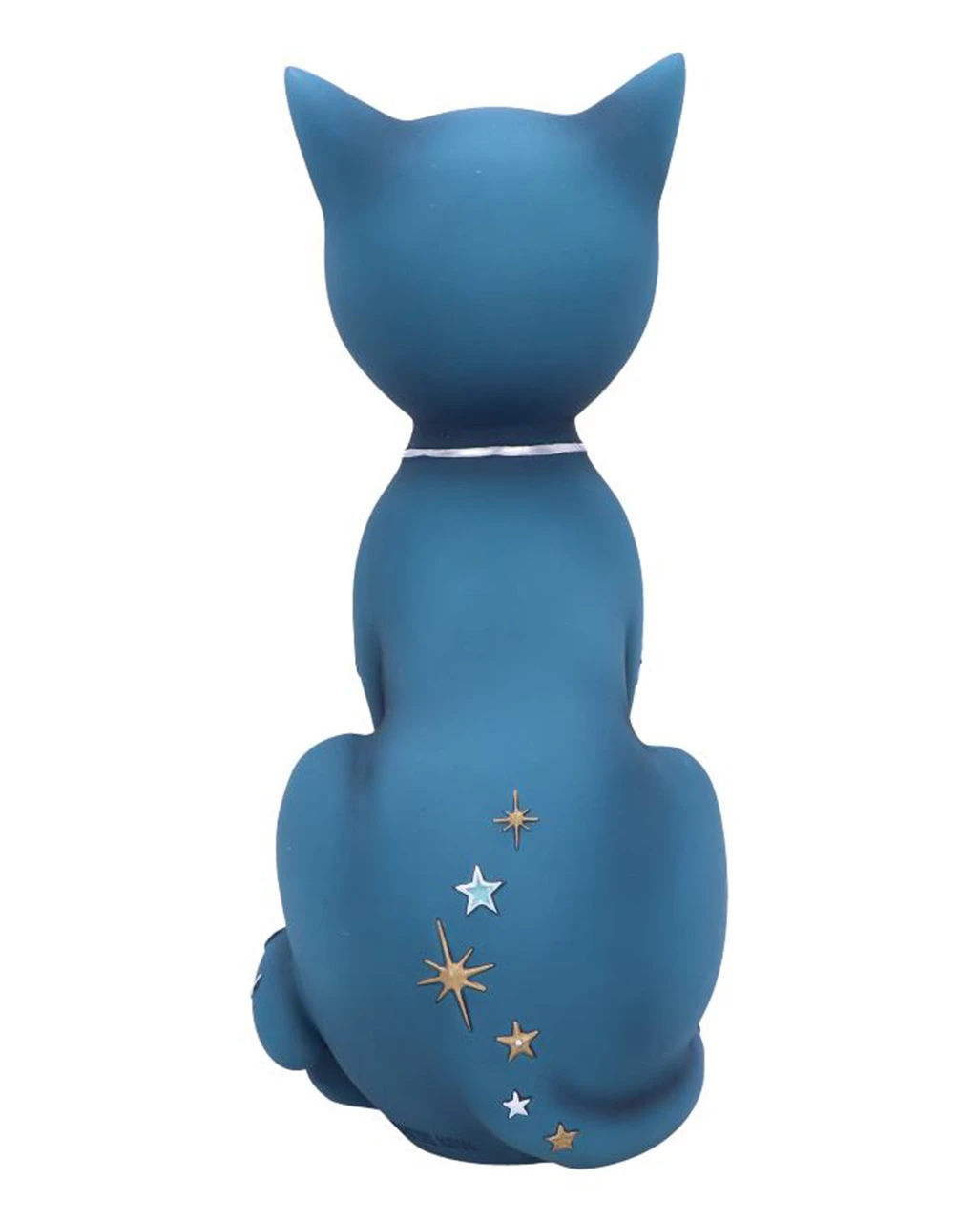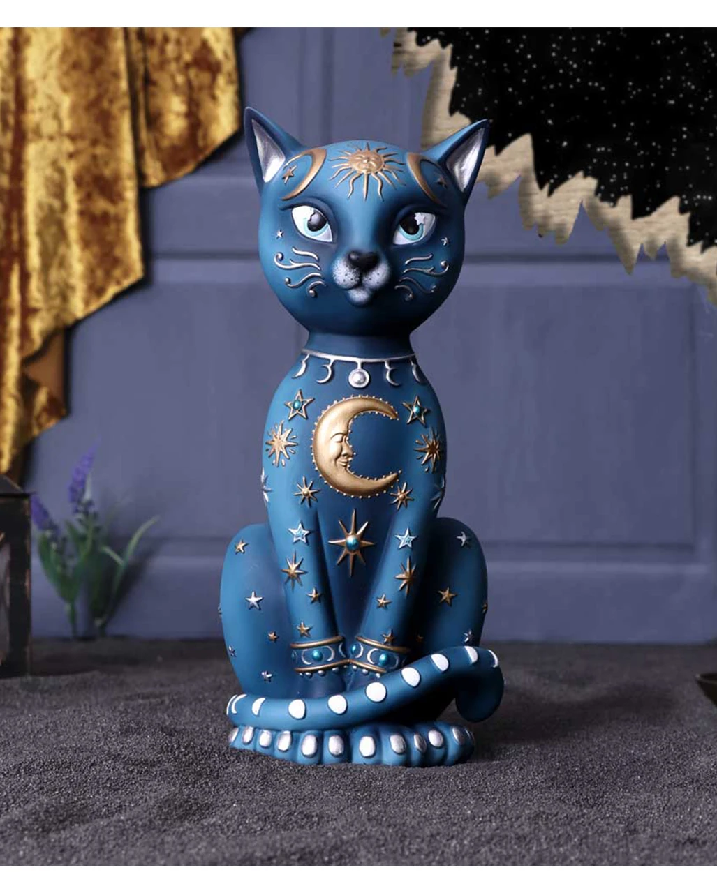 Das himmlische Kätzchen ist blau bemalt, mit goldenem Mond und Sternen verziert und hat ein silbernes Halsband um den Hals. Gegossen aus feinstem Polyresin (Kunststein) und anschließend fachmännisch handbemalt, ist die Celestial Kitty Figur perfekt, um deinem Zuhause einen Hauch von Spiritualität zu verleihen.