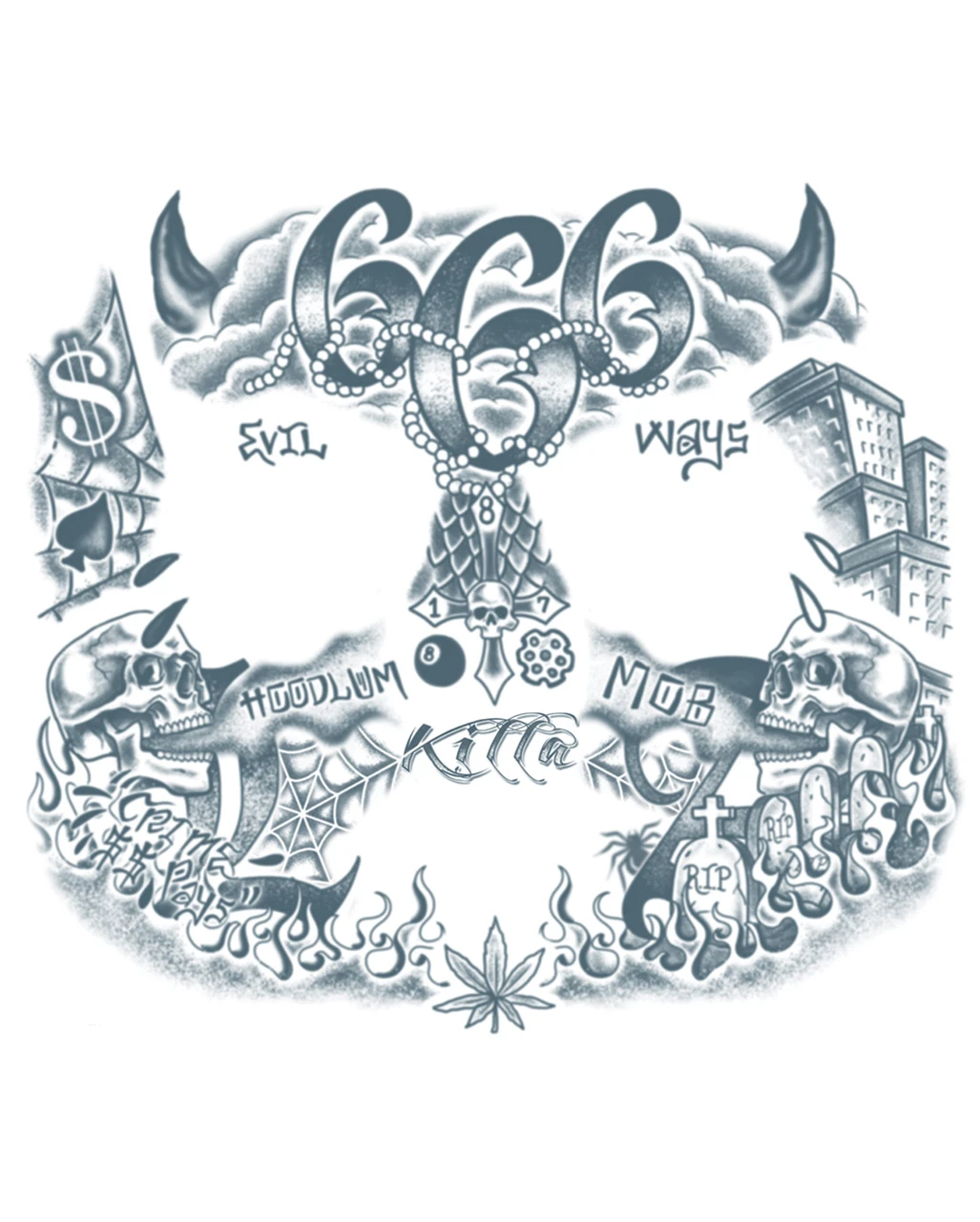 Mit dem Face Tattoo Gangster vervollständigst du deine Verkleidung an Halloween und auf Mottopartys! Du kannst das Fake-Tattoo unkompliziert mit einem feuchten Tuch oder Schwamm anbringen und genauso einfach mit Baby- oder Olivenöl wieder entfernen. Das Tattoo zeigt eine geniale Anordnung vieler Gangster Symbole und Schriften wie den Ausdruck „Evil Ways“. Weitere Aufklebe Tattoos als Kostüm Zubehör wie das Prison Break Tattoo Der fügsame Teufel findest du natürlich in einer riesen Auswahl bei uns im Shop.