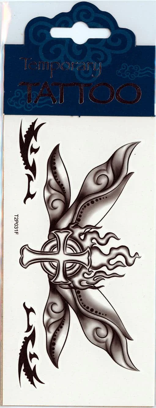 Packung enthält ein Motiv Kreuz mit Flammen und Schmetterlingsflügel sowie zwei Tribal Schwingen.