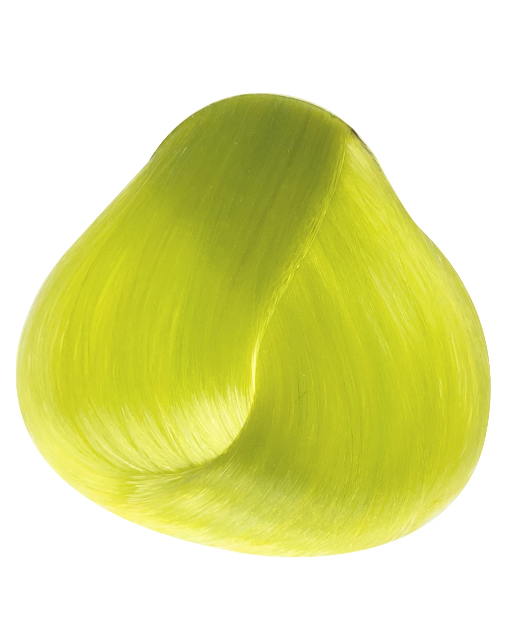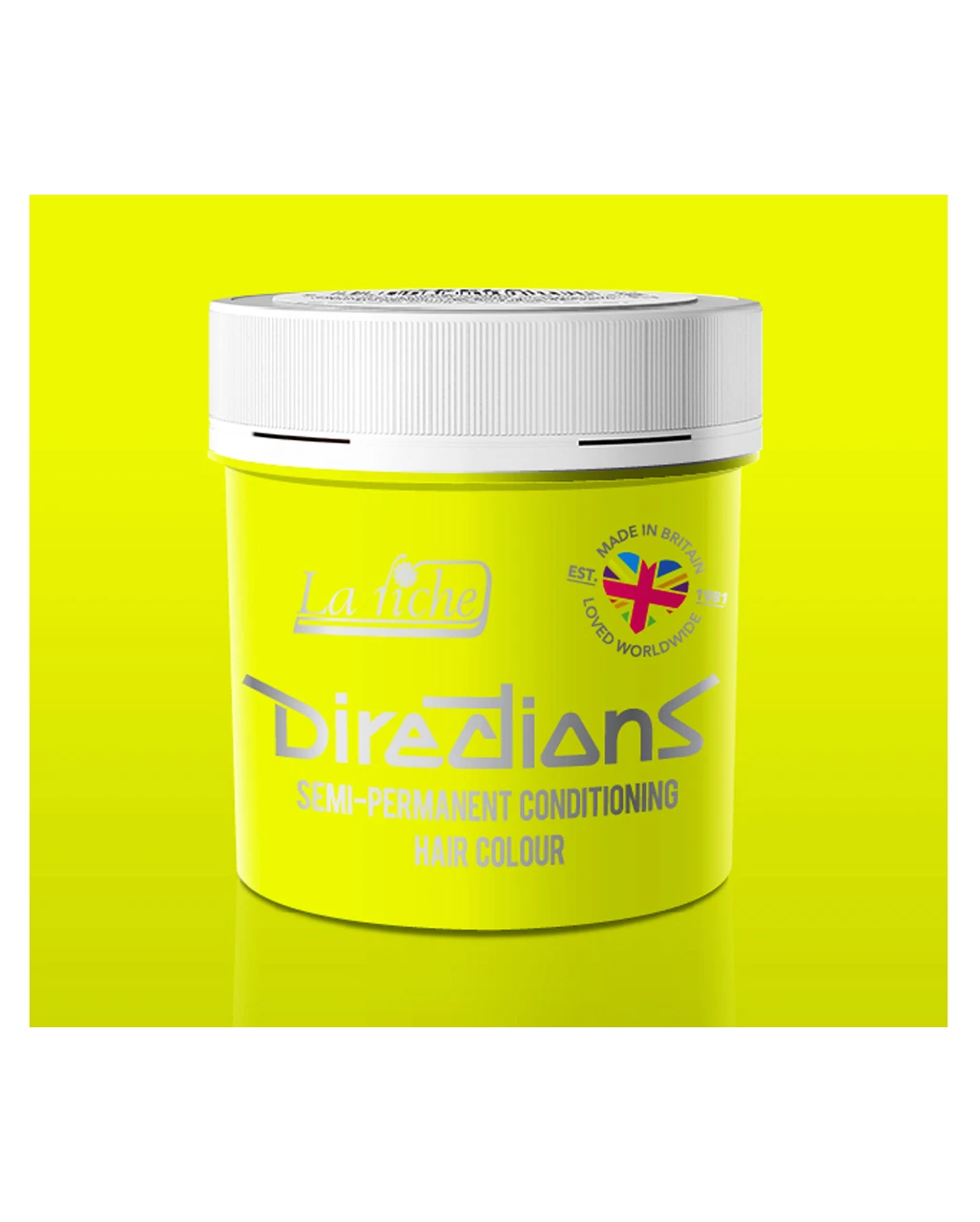 Die knallige, neongelbe Haartönung ist ein absolutes Highlight unter den Haarfarben und somit heiß begehrt. Mit dieser einmaligen Farbnuance bist du der Hit auf jeder Rave Party, da deine imponierende gelbe Mähne im Schwarzlicht leuchtet. Die Flouresecent Glow Haarfarbe von Directions ist vorallem in der Cyber Goth und Gothic Szene sehr beliebt.