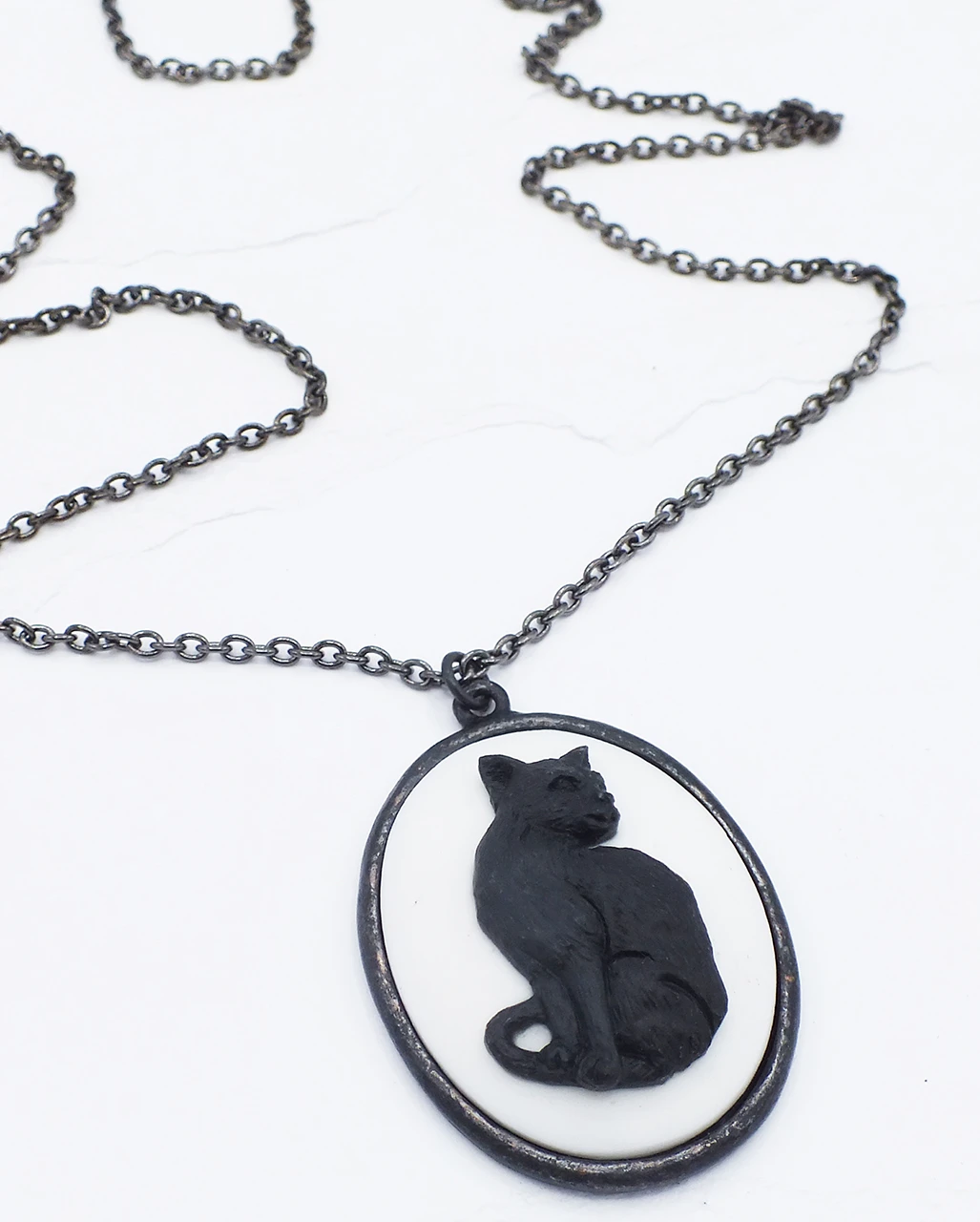 Mit der Gothic Kette Katze bekommen Katzen Liebhaber einen ganz besonderen Halsschmuck. Der schöne Halsschmuck mit Katzen Anhänger ist im Kamee Design gestaltet und versprüht Mystik pur! Vampir Königinnen und schwarze Feen werden die Katzen Kette genauso lieben wie Gothics. Trage das Schmuckstück zu deinem Halloween Kostüm oder setze im Alltag Akzente und kombiniere es zu deinem Outfit!