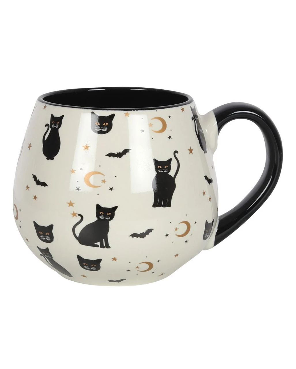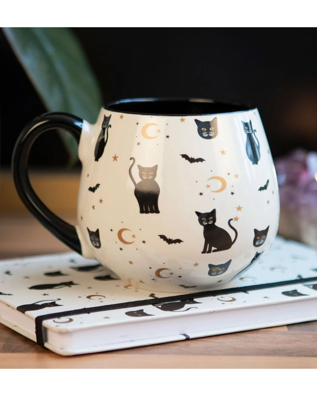 Unsere bezaubernde Tasse zeigt ein Motiv mit schwarzen Katzen, Fledermäusen und mystischen Mondsicheln. Der Print dürfte nicht nur Gothic- & Pagan Fans begeistern, sondern auch für Katzenfreunde ein echtes Must-have sein. Genieße deinen Kakao, Tee oder Kaffee aus dieser einzigartig designten Katzen Tasse, und gönn dir einen Schluck Magie! Als Halloween Geschirr kommt diese Lieblingstasse beim Beschenkten ebenfalls super an.