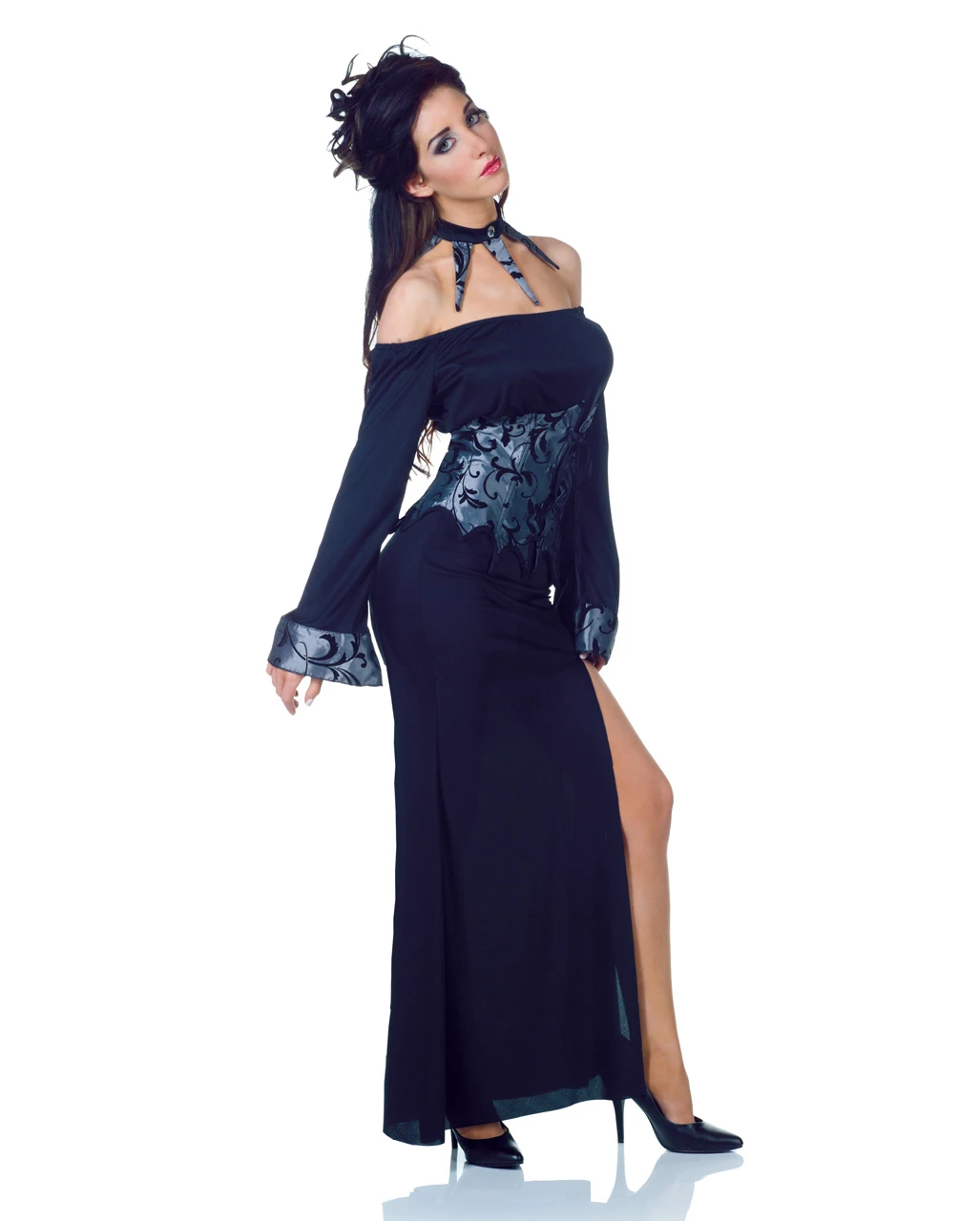 Das Hellseherin Kostüm besteht aus einem bodenlangen Kleid, einem Taillenmieder und einem hübschen Kropfband. Das elegante Kleid aus schwarzem Satin hat einen eleganten Beinschlitz. Der Oberkörper wird durch die schulterfreien Ärmel und das silberfarbene Taillenmieder sehr schön betont. Die Ärmel des Wahrsagerin Kostüms schließen mit dem gleichen Stoff ab, aus dem das Mieder gefertigt ist. Für den passenden Schmuck sorgt das schwarze Kropfband, das von mehreren Strahlen verziert wird. Für die passenden, geheimnisvollen Augen sorgen die Lightening Kontaktlinsen in Kombination mit den Lange schwarze Wimpern.