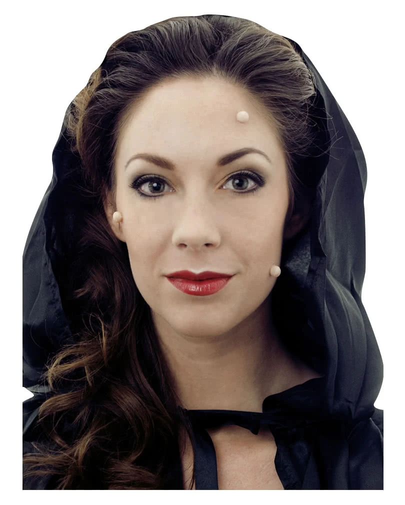 Das Set enthält 3 Warzen, diese werden mit Mastix Hautkleber klein auf die Haut montiert. Für noch realistischere Ergebnisse einfach die Ränder mit Hautfarben Make Up Kit / Flesh Stack kaschieren. Wenn du noch eines draufsetzen willst, dann einfach ein paar zurechtgestutzte Theater Haare braun auf der Warze platzieren.