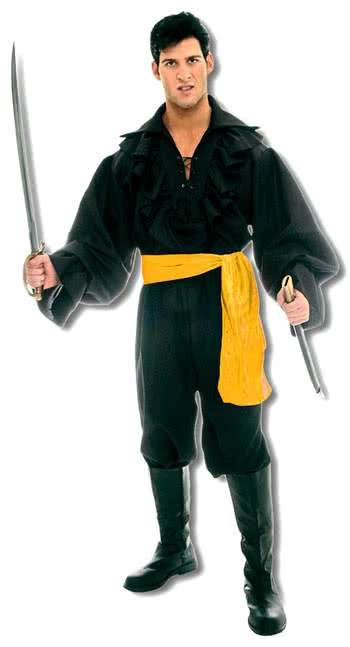 Das Hochsee Bandit Premium Kostüm in edlem schwarz besteht aus dem weitgeschnittenen Hemd mit weiten Ärmeln und gerüschtem Kragen. Das Rüschenhemd besitzt das an der Front geschnürt wird. Zusätzlich ist noch die schwarze Hose im Lieferumfang, ebenso wie die goldgelbe Schärpe die um die Hüfte gebunden wird.