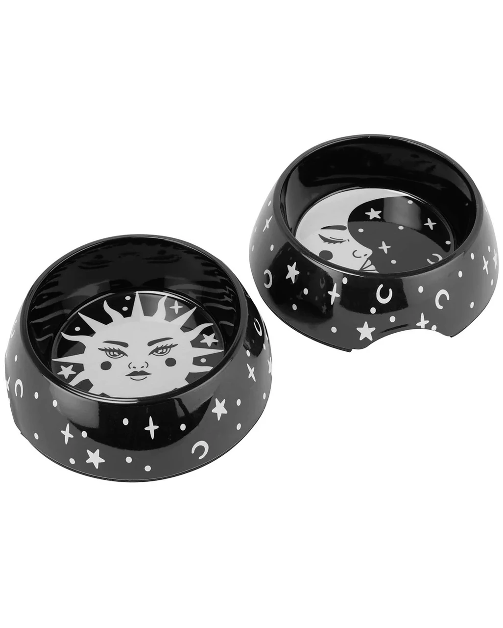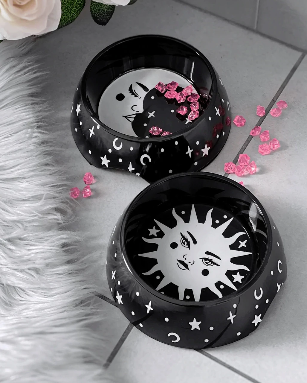 Nichts ist erfüllender, als ein sattes, zufriedenes Haustier. Und ganz egal, ob Hund oder Katze: Wenn unsere Lieblinge gierig-schmatzend über ihrem Napf stehen, gibt uns das ein gutes Gefühl. Wer noch niedliche Schälchen für seinen pelzigen Liebling sucht, sollte die KILLSTAR Cosmic Futternäpfe bestellen. Als Gothic Haustier Schale machen sie jeden alternativen Haushalt komplett. Du bekommst zwei schwarzweiße Tiernäpfe mit kosmischen Motiven. Befülle sie wahlweise mit Nass- oder Trockenfutter, und biete deinem Tier auch immer eine Schale frisches Wasser an!