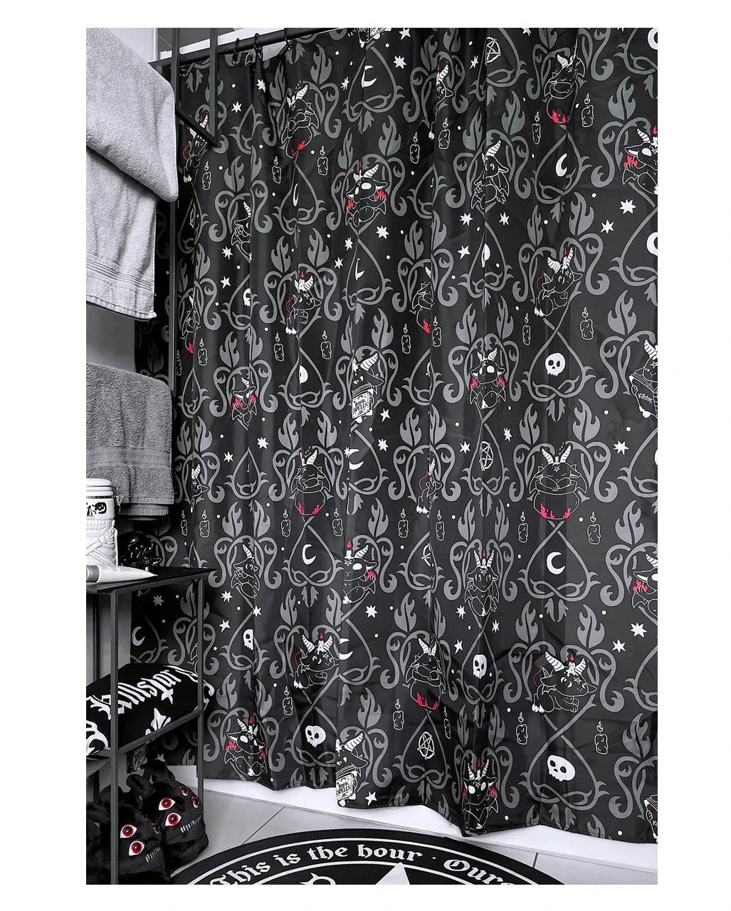 Mit diesem teuflisch gutaussehenden Duschvorhang von KILLSTAR wird dein Badezimmer zur düsteren Feuchtzelle. Ganz nach deinem Geschmack erscheint diese Gothic Duschgardine mit Damastdruck und Baphomet Symbolen. Kleine Totenschädel, Halbmonde und Sterne sind ebenfalls mit am Start!