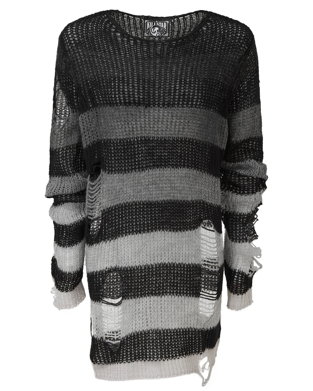 Der weiche KILLSTAR Grady Strickpullover erinnert an den Grunge der 90er Jahre und eignet sich perfekt zum Überziehen – oder zum Tragen als Einzelstück. Schwarz und gedämpft grau-weiß gestreift, mit extra langer Länge für einen relaxten Look. Mit Distress-Details und tiefem Ausschnitt. Ideal für Festivals, Mitternachtsspaziergänge mit dem Mond und verkatertes Sonntagsvergnügen. Kombinieren den KILLSTAR Grady Strickpullover mit schwarzen Leggings und einem eleganten Halsband für deinen legeren Look.