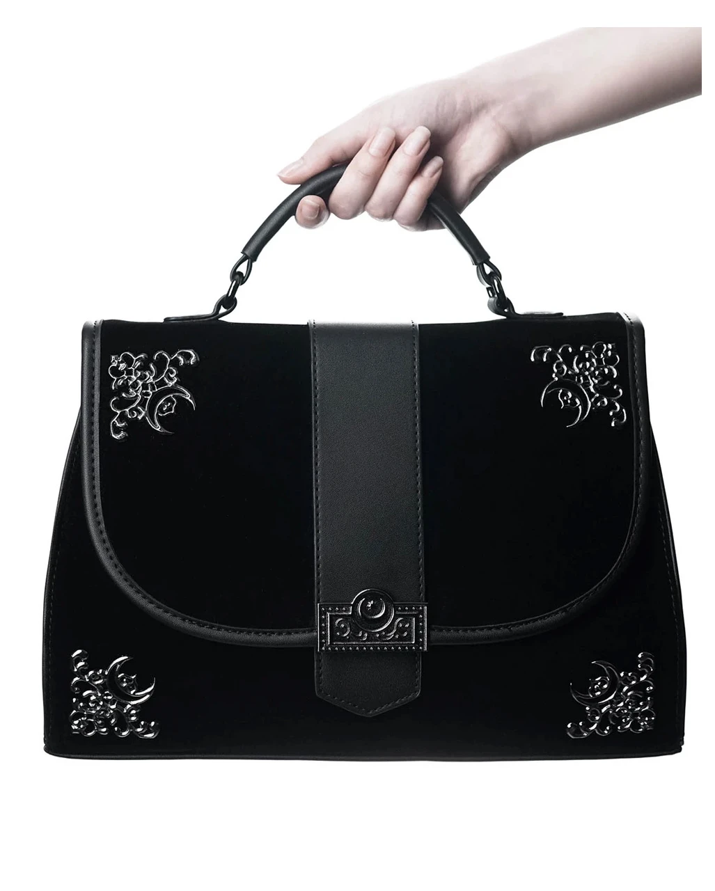Lass dich von der KILLSTAR Moonlight Handtasche aus Kunstleder und üppigem Samt verzaubern. Mit verschnörkelter Hardware auf der Vorderseite, Magnetverschluss und einfach abnehmbarem Schulterriemen ist diese KILLSTAR Tasche das perfekte Gothic-Accessoire für den Alltag.