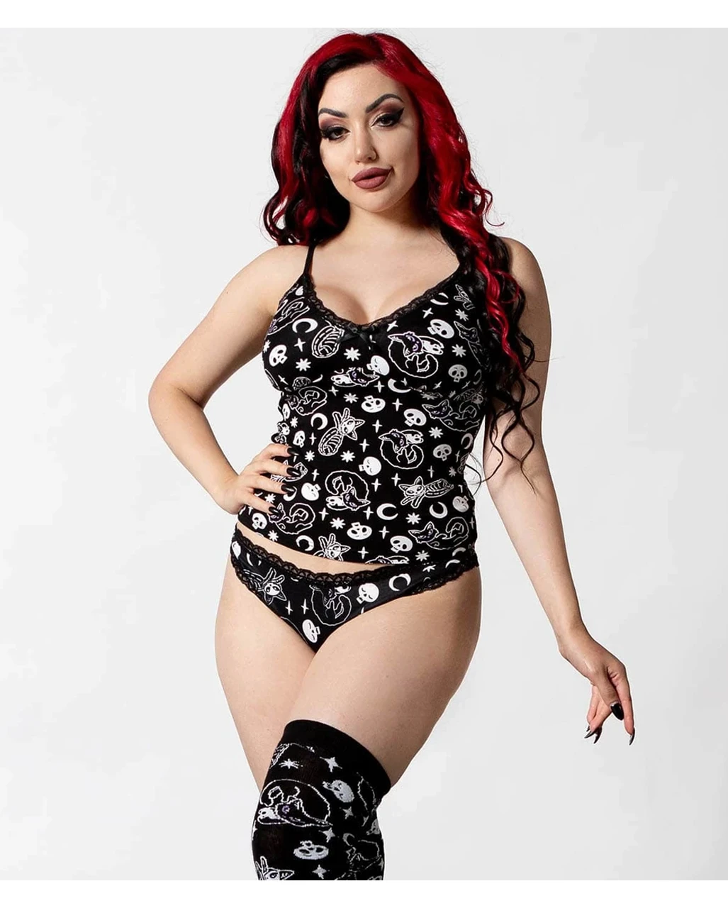 Bei diesem Top macht es die Mischung aus süß und spooky: Unser KILLSTAR Purr Off Top kommt mit niedlichen Motiven wie Totenköpfen, träumenden Katzen und Mondsicheln. Unser schwarzweißes Nacht Top ist dazu aber auch super gemütlich, sodass jede Nacht ein voller Genuss wird. Pimpe jetzt deinen Kleiderschrank auf und gönn dir diese einzigartig designte Gothic Unterwäsche von KILLSTAR!