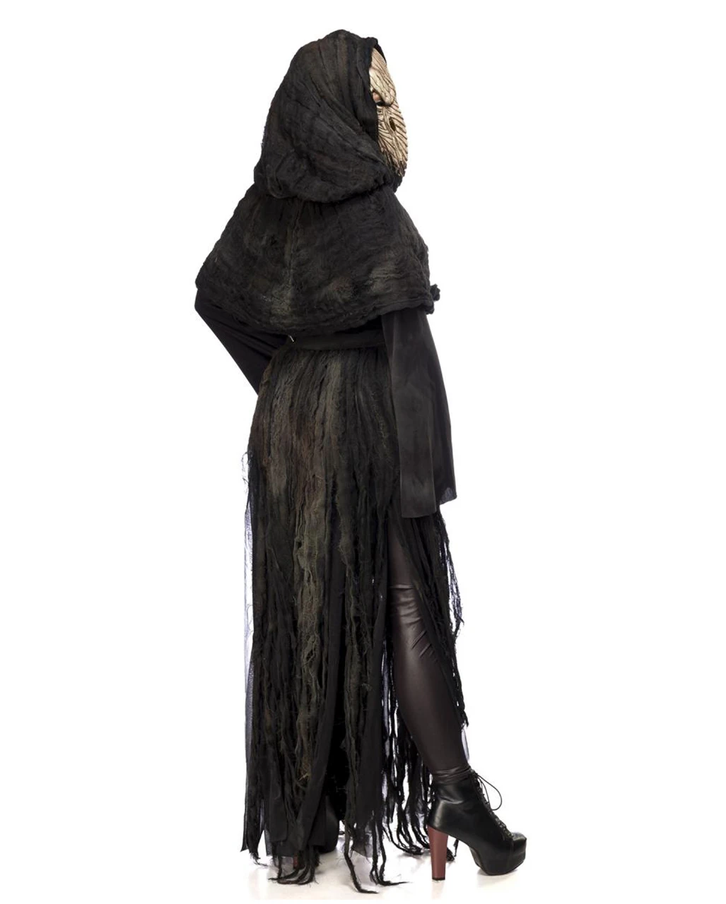 Das Komplettset für Frauen besteht aus langärmeligem Oberteil, Herrenrock im Fetzenlook, Kapuzencape, Gürtel, der fantastisch aussehenden Maske und der mit Raben-Skelettschädeln verzierter Halskette. Das gesamte Outfit sieht durch verschiedene Lagen, Farbspritzer und Fetzen verschlissen und gebraucht aus, was den Endzeit-Look unterstreicht und letztlich das gesamte bedrohlich wirkende Pestdoktor Damenkostüm ausmacht. Die Schnabelmaske ist aus Latex gefertigt und besitzt mit Netz unterlegte Augenaussparungen. Mit flexiblem Gummiband gehalten, sorgt die Maske für den optimalen Sitz unter dem Kapuzencape. Den Abschluss bildet die Halskette mit Kunststoff Raben Sklettschädel.
