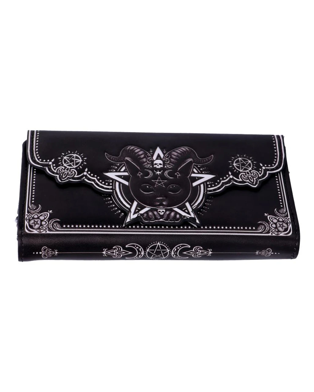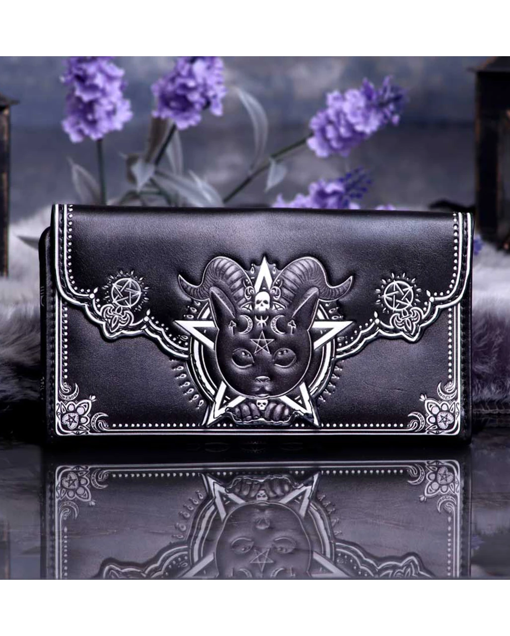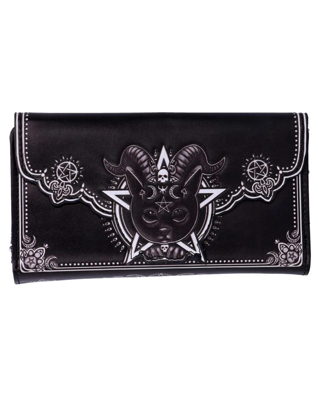Die Pawzuph Kult Cutie Geldbörse besitzt eine klassische Form und gehört in jedem Fall in deine Tasche, wenn du deine Gruft verlässt. Die geprägte Katze mit Ziegenhörnern und das Pentagramm sind ein echter Blickfang. Auch als Geschenk ist das Gothic Portemonnaie eine exzellente Wahl. Der mit kunstvollen Silberdetails verzierte Pawzuph Geldbeutel ist außerdem aus Kunstleder gefertigt und hat mehrere Fächer für Karten, Bargeld und Münzen.
