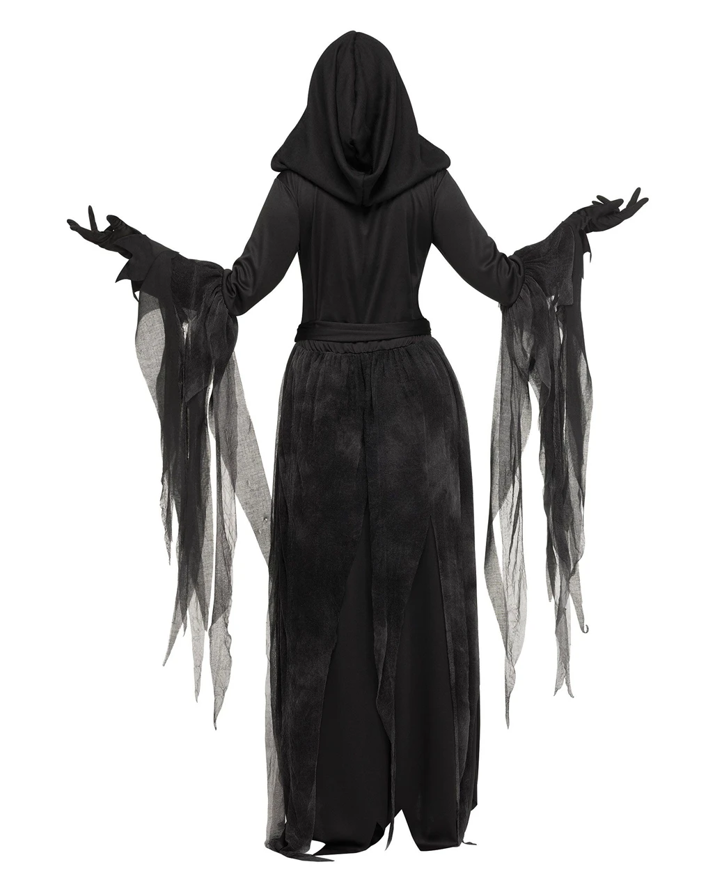 Unser seelenloser Reaper Damen Kostüm ist aus weichem Material gefertigt und für Damen in Größe 36/38 und 40/42 geeignet. Es handelt sich um ein langes Sensenmann Kleid für Frauen, das mit gezackten Details und langen, dunklen Stofffetzen an den Ärmeln designt ist. Eine Kapuze ist ebenfalls am Kleid angebracht. Damit der Look des Tod bringenden Sensenmanns authentisch wird, bestellst du die Grim Reaper Sense gleich dazu.