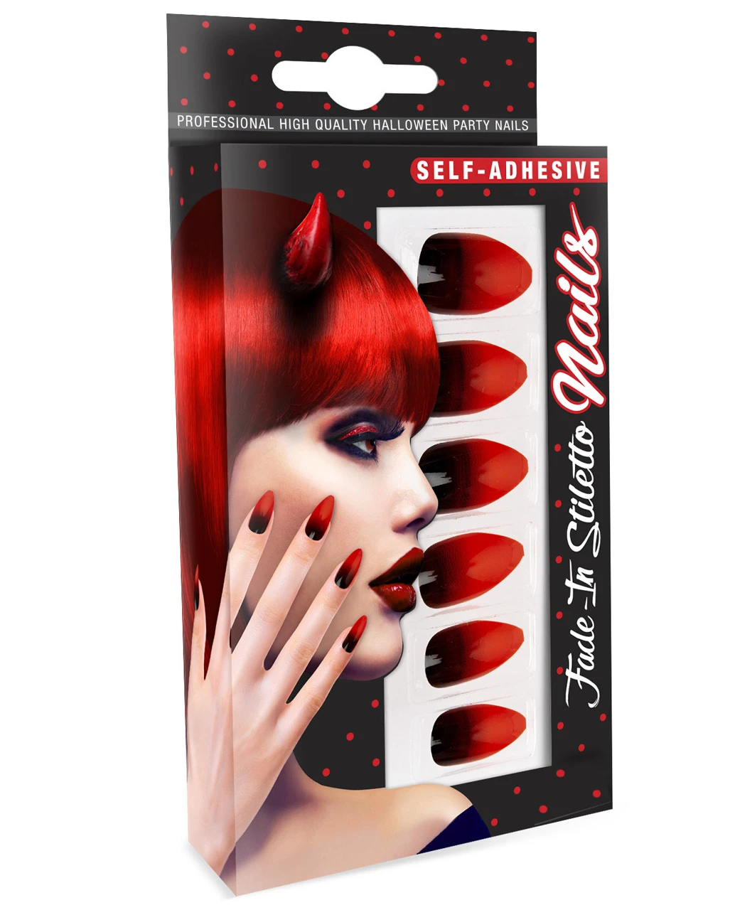 Du bekommst 12 selbstklebende Stiletto Fingernägel als Kostümzubehör. Die Clip on Fingernägel für Halloween sind besonders praktisch, da sie sich ohne großen Zeitaufwand schnell anbringen lassen und zudem wiederverwendbar sind. Die dunkelroten Fingernägel sind aus Kunststoff, sehen super realistisch aus und lassen sich ebenso schnell entfernen, wie sie sich anbringen lassen. Wer noch Fingernägel für Hexen Kostüme sucht, findet diese auf Horror-Shop.com. Auch unsere genialen Spinnen Fingernägel G.I.D 12 St. und weitere Fingernägel für Fasching & Halloween erwarten dich in unserem Onlineshop.