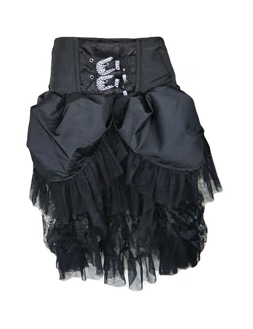 Unser Taftrock mit Strass Applikation ist aus schwarzem Taft sowie mit einem Spitzen Unterrock versehen, der den Rock hinten länger macht. Dieser Gothic Rock ist vorne kurz wie ein Minirock, was ihn sehr sexy wirken lässt. Unter den Strass Schnallen befindet sich ein gotischer Spitzenbesatz, der den Glitzerschnallen einen besonderen Touch verleiht. Passend zu diesem Taftrock gibt es unser Spitzentop mit Glitzerschnallen sowie die ultra sexy Inamagura Damenpumps mit Lochmuster . Der Gothic Taftrock wird seitlich mit einem Reißverschluss geschlossen und passt sich durch einen breiten Gummizug auf der Rückseite prima deiner Figur an.