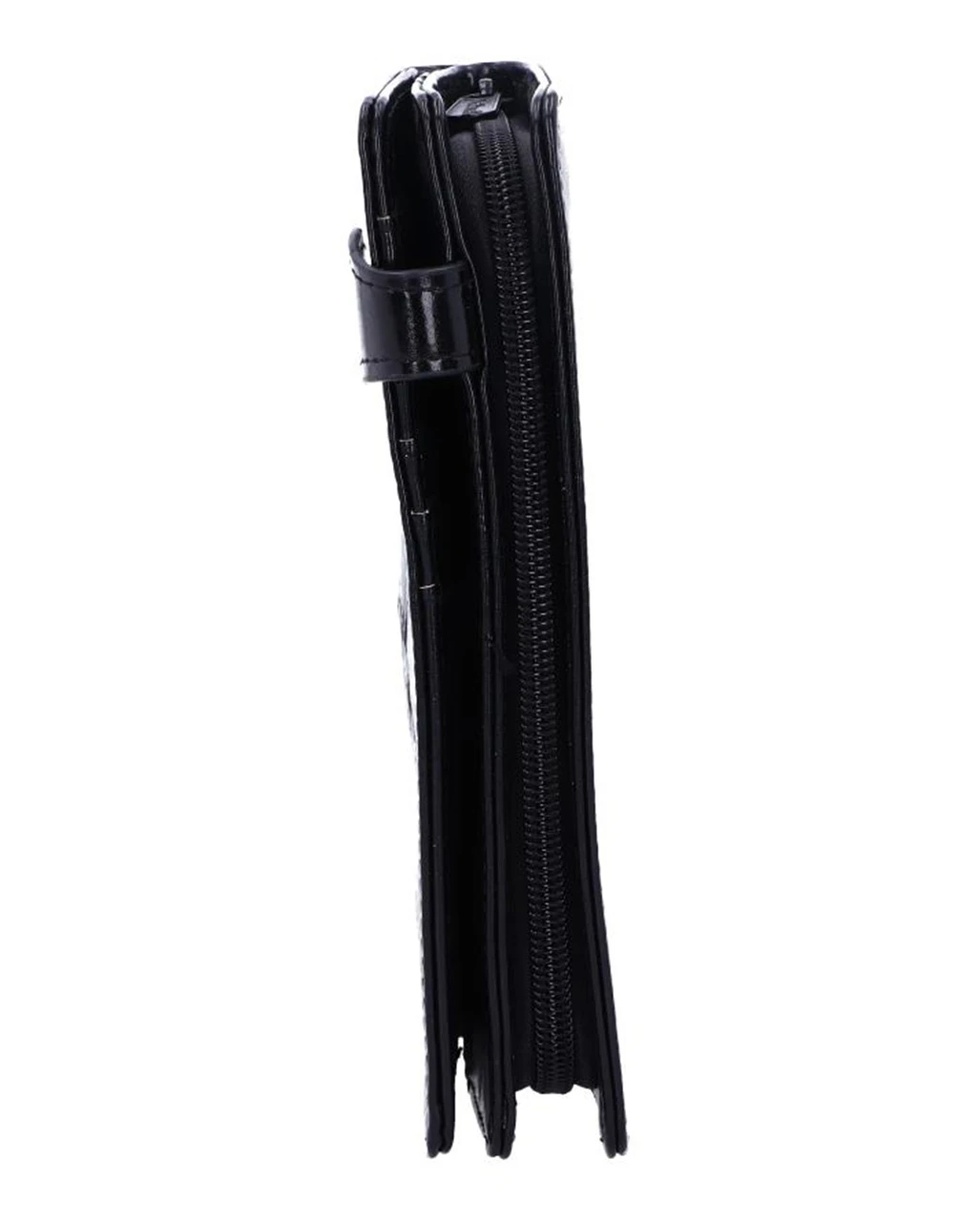 Damit ist der Totenschädel Tarot Geldbeutel schon mal ein echter Hingucker, der Diebe und Langfinger abschrecken könnte. Aber nicht nur der grinsende Totenkopf sorgt für Sicherheit. Geschlossen wird das Portemonnaie mit einem Druckknopf auf einer schwarzen Leiste. Mit einem großen Reißverschlussfach ist diese alternative Geldbörse klein genug, um in jede Handtasche zu passen und gleichzeitig geräumig genug, um alle deine Karten und dein Bargeld unterzubringen. Passend dazu findest du bei uns noch andere Gothic Fashion Accessoires wie die KILLSTAR Grave Digger Totenkopf Handtasche.