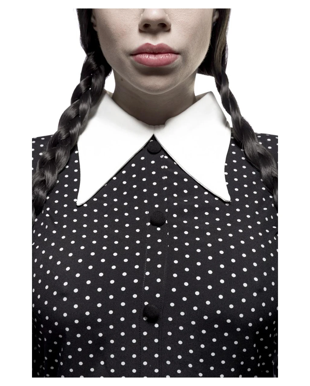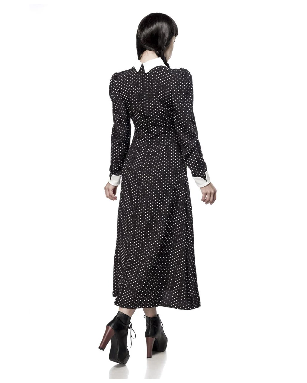 Wenn Wednesday Adams eine Schwester hätte, würde diese wahrscheinlich Tuesday heißen und ihr vom Kleidungsstil in nichts nach stehen. Tuesday liebt genauso wie Wednesday dunkle, lange Kleider mit Puffärmel und großem weißen Kragen. Um den gewissen Unterschied darzustellen und nicht ganz so düster und pessimistisch auszusehen, verfügt das Tuesday Kostüm aus luftigem Stoff über weiße Punkte und einer Zierknopfborte auf der Vorderseite.